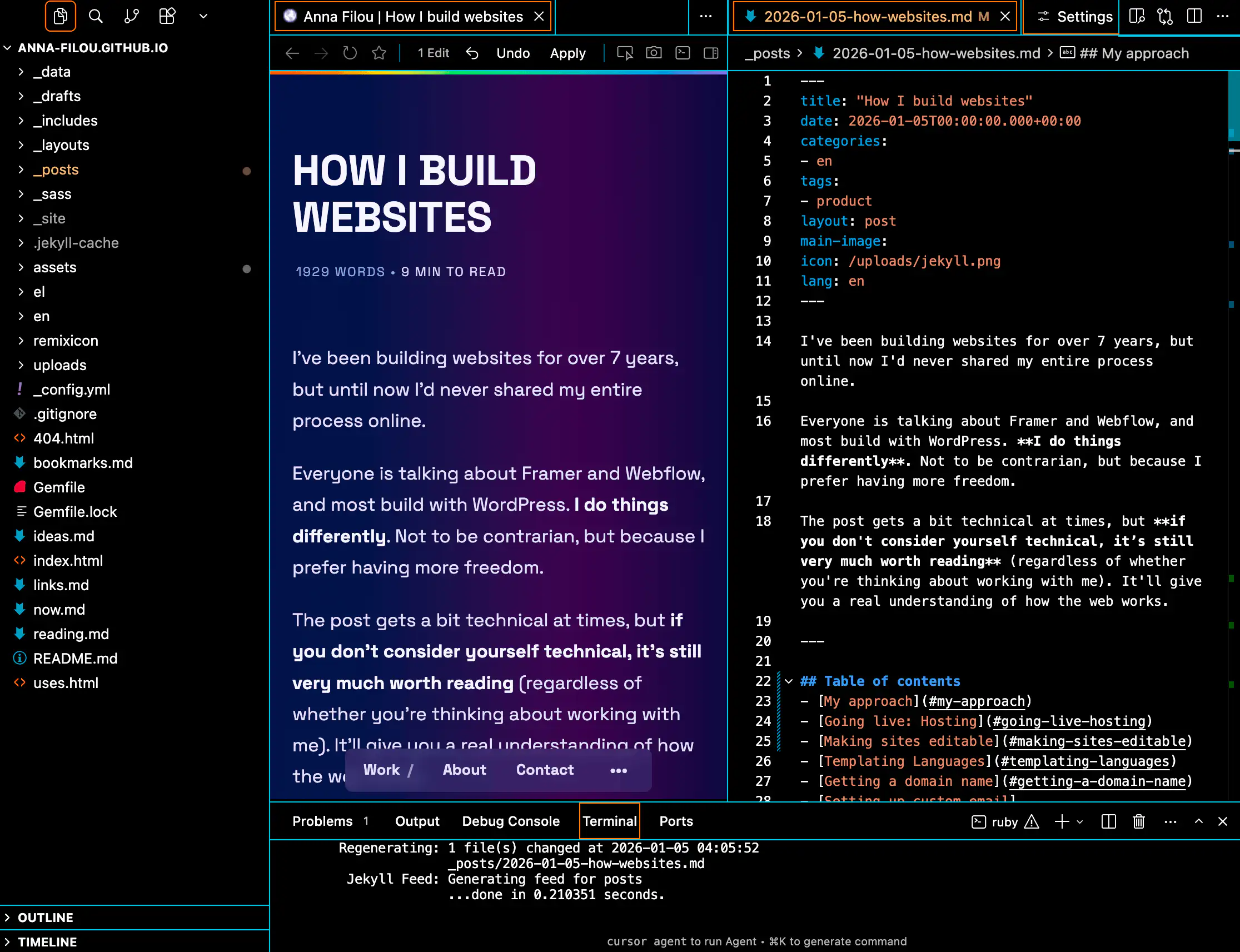 And now you know how I make websites! Of course the process is subject to change. I love trying out all the latest tools, but I’ve been loyal to Jekyll for so long because it just… works.