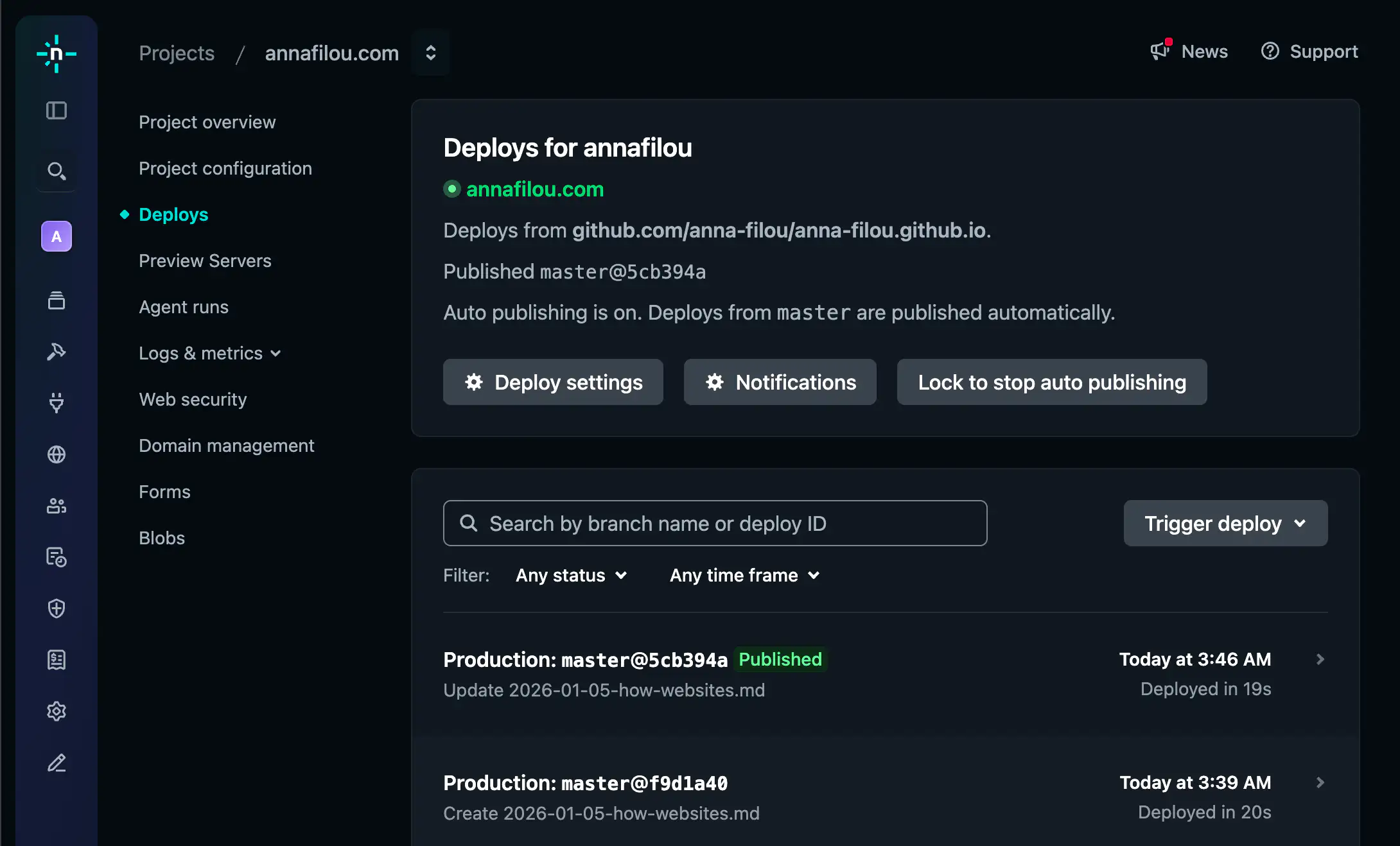 To put the website on the internet, I use Netlify, a Content Delivery Network (CDN). They offer free hosting, and since they’re a CDN, that means they put a copy of my website (_site folder) on many servers across the globe, and they serve from the one closest to the visitor for increased speed.